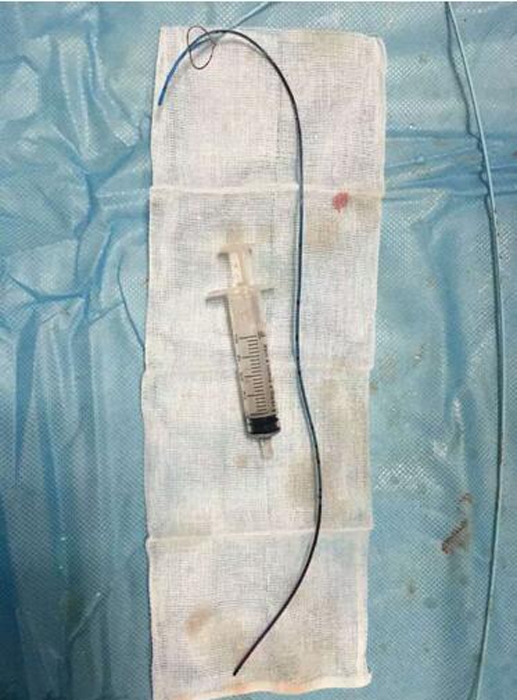 ??? 手術(shù)遇到了艱巨的挑戰(zhàn),需更改手術(shù)方案。血管外科專家王李華教授及陸煒主任短暫商討后,臨時(shí)施妙招,先將PICC導(dǎo)管拉出心臟,再將圈套器牽引導(dǎo)管至下腔靜脈,捕捉后緩慢拉出體外,導(dǎo)管竟長(zhǎng)達(dá)30cm(見圖2)。