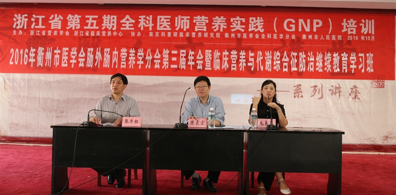 ??? 10月28日—30日,浙江省第五期全科醫(yī)師營養(yǎng)實(shí)踐(GNP)培訓(xùn)、衢州市醫(yī)學(xué)會(huì)腸外腸內(nèi)營養(yǎng)學(xué)分會(huì)學(xué)術(shù)年會(huì)暨市級繼續(xù)醫(yī)學(xué)教育項(xiàng)目《臨床營養(yǎng)與代謝綜合征防治》培訓(xùn)班在我院五樓學(xué)術(shù)報(bào)告廳舉行,來自全市臨床及相關(guān)的營養(yǎng)工作同仁100余人參加了培訓(xùn)班。