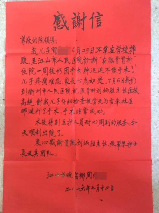 ??? 10歲的小周來自江山,6月29日,小周在學(xué)校玩耍時(shí)不慎摔跤,結(jié)果導(dǎo)致左肘部腫痛畸形,父母送小周在當(dāng)?shù)蒯t(yī)院檢查后發(fā)現(xiàn)小周“左肱骨髁間骨折”,住院一周后,小周左手肘部腫脹明顯,無法進(jìn)行手術(shù),家屬十分焦急,7月6日,家屬帶著小周來到我院骨科就診。在安撫患者家屬不安情緒的同時(shí),醫(yī)生劉炳勝詳細(xì)向患者及家屬講解骨折相關(guān)知識(shí)、手術(shù)方案和術(shù)前、術(shù)后注意事項(xiàng)。入院當(dāng)天立即完善相關(guān)化驗(yàn)檢查,做好術(shù)前準(zhǔn)備,在劉炳勝醫(yī)師和雷奉林醫(yī)生共同配合下,手術(shù)進(jìn)行的非常成功。小周左手肘部疼痛得到控制和緩解,術(shù)后4小時(shí)即指導(dǎo)患者進(jìn)行左手指及腕關(guān)節(jié)伸屈活動(dòng)等相關(guān)肢體功能鍛煉。小周術(shù)后恢復(fù)超出預(yù)計(jì),出院當(dāng)天,父母寫下感謝信,感謝劉炳勝醫(yī)生和護(hù)士長(zhǎng)張翠琴及護(hù)理團(tuán)隊(duì)的細(xì)心治療和照顧。