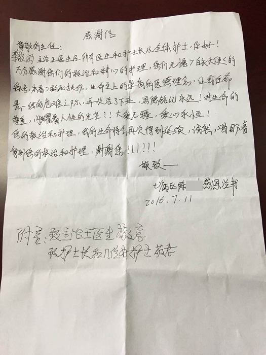 ??? 6月25日晚上,小陳因從高處墜落傷導(dǎo)致頸椎、胸椎、腰椎多處骨折,由下級(jí)醫(yī)院轉(zhuǎn)入我院骨科治療。轉(zhuǎn)入時(shí)患者雙乳頭平面以下感覺消失,雙下肢全癱,雙小腿及尾骶部多處二期壓瘡帶入。入院后雙下肢血管彩超提示:雙側(cè)股淺動(dòng)脈、腘動(dòng)脈微小斑塊形成,左側(cè)股總靜脈、股深靜脈、股淺靜脈、腘靜脈、脛后靜脈血栓形成。請(qǐng)血管外科、ICU會(huì)診后當(dāng)晚,小陳立即在局麻下行經(jīng)皮靜脈內(nèi)濾網(wǎng)置入術(shù),及時(shí)有效避免了深靜脈血栓的發(fā)生。在醫(yī)護(hù)人員精心治療下,小陳病情得到控制。因?yàn)樾£愂峭獾厝?,家庭情況特殊,家屬不能及時(shí)在院陪護(hù),護(hù)士們平日給予治療的同時(shí),還給予細(xì)心的生活護(hù)理,小陳雙小腿及尾骶部壓瘡明顯好轉(zhuǎn)。因疾病帶給他很大的心理負(fù)擔(dān),讓他失去了對(duì)生活的信心,產(chǎn)生了沮喪、不安、消極的情緒,護(hù)士們及時(shí)給予小陳心理護(hù)理,關(guān)心和安慰患者,用自己的愛心和細(xì)心感動(dòng)著小陳。因小陳雙乳頭平面以下全部癱瘓,只有雙手可以活動(dòng),所以用雙手寫下了這封感謝信。