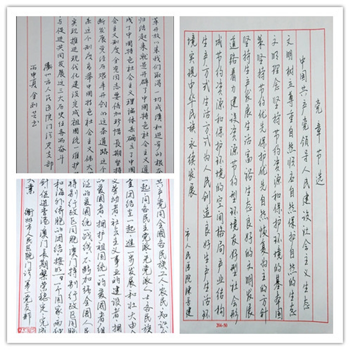 ??? 為迎接建黨95周年,推動(dòng)我院“兩學(xué)一做”學(xué)習(xí)教育向縱深發(fā)展,近日,我院黨委組織開(kāi)展了“學(xué)黨章?抄黨章”硬筆書(shū)法比賽。