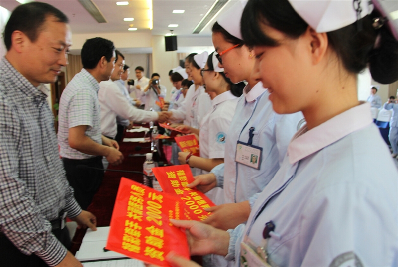 ??? 5月11日下午,由衢州市衛(wèi)生計生委、市民政局主辦,市人民醫(yī)院和市福彩中心承辦的“福彩牽手,關愛慰問困難醫(yī)務人員”活動在我院五樓學術報告廳舉行,并共同慶祝第105個國際護士節(jié)。市政府副秘書長季根壽、市民政局局長徐延山,市衛(wèi)生計生委主任陳根成、市衛(wèi)計委黨委委員張???,市民政局黨委委員許宇昌、我院院長陳震宏等領導參加了此次活動。