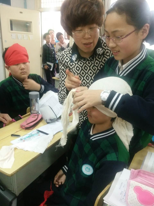 ??? 4月22日下午,愛心志愿者們來到華茂外國語學(xué)校七(2)班,利用一節(jié)課的時間讓同學(xué)們掌握了外傷包扎的要點(diǎn)與注意事項(xiàng);通過視頻和現(xiàn)場示范指導(dǎo),讓同學(xué)們學(xué)會了打平結(jié)和三角巾頭部帽式包扎法。同學(xué)們看著自己像變魔術(shù)般地將 “死結(jié)”樣的繩結(jié)輕松地一抽就打開,激動地大叫“我終于學(xué)會了”、“太神奇了”。