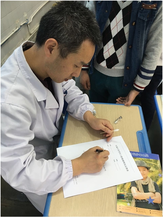 ?袁正飛主任認真填寫“大成小學學生口腔健康反饋表”?