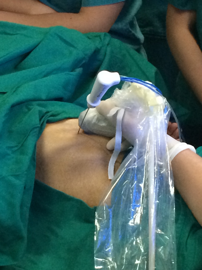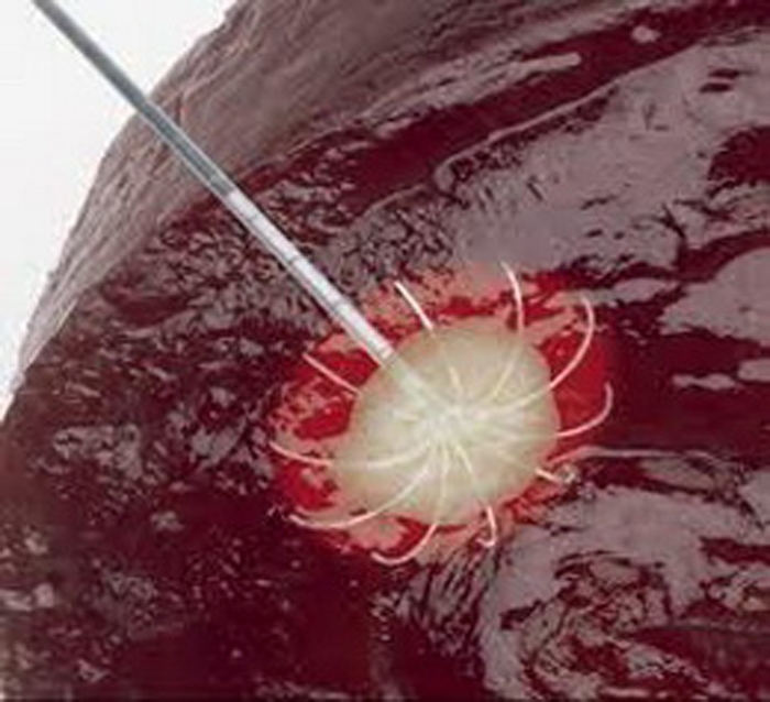 ??? 近日,毛大爺接受了這項治療。在超聲引導(dǎo)下,由皮膚直接插入細(xì)針直達(dá)尾狀葉腫瘤瘤體,通過射頻能量徹底破壞腫瘤。治療過程不到半小時,體表除了一個難辨的針眼外沒有留下任何疤痕。術(shù)后當(dāng)天就下床活動,第三天行動自如。