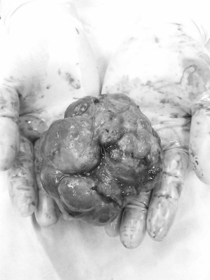 ??? 青春期的少女乳房有一個巨大腫塊,需要手術(shù)治療。單純切除乳房腫塊并不難,但如何選擇手術(shù)切口,讓疤痕隱蔽,又盡可能減少乳管的損傷,需要費一番周折。我安排女孩當(dāng)日住院,完善術(shù)前檢查,第二天下午手術(shù)。術(shù)中我選擇盡可能小的切口,并設(shè)計在乳腺的下皺折線上,同時采用精細的皮內(nèi)縫合,這樣切口愈合后會形成一條白線,避免疤痕偽足,也比較隱蔽。然后我從乳腺的外緣去分離腫塊,避免了乳暈區(qū)感覺神經(jīng)的損傷,也保護了乳頭下方的導(dǎo)管。最后采用像胎兒分娩一樣的方法從4cm的切口中拖出了腫塊,腫瘤連同包膜被完整切除。20分鐘后冰凍病理檢查報告是良性的,與術(shù)前判斷一致。2天后,女孩順利出院,無需拆線。