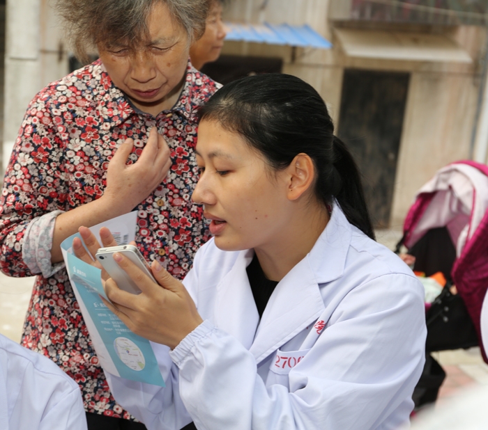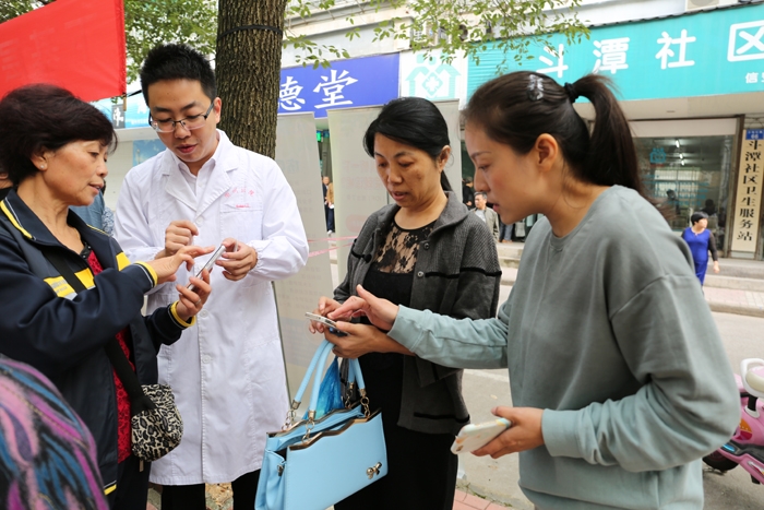 工作人員幫助居民關(guān)注醫(yī)院官方微信訂閱號