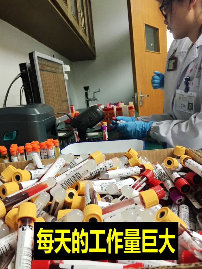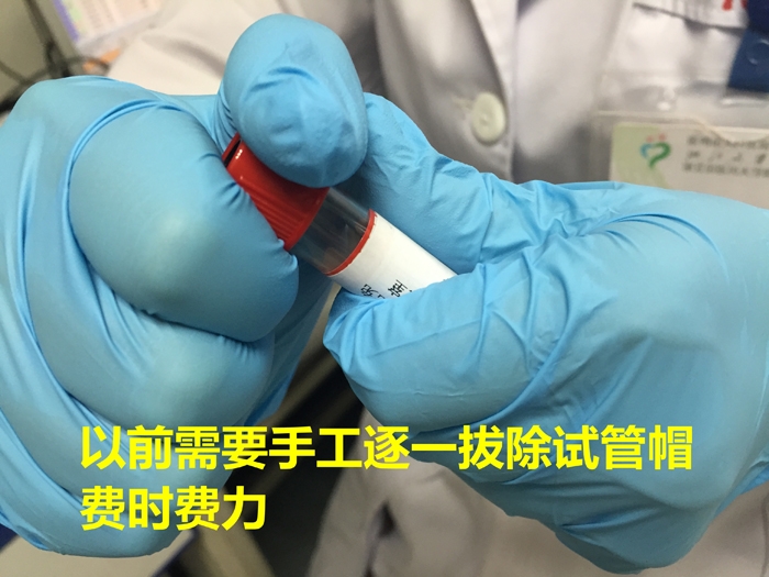 ??? ?每天這樣的標(biāo)本在1800例至2500例左右,就開試管蓋而言,一個(gè)人做同樣的一個(gè)動(dòng)作就得做1800次到2500次,新同事開得手上起了泡,時(shí)間久了,大家的手指上都出現(xiàn)了老繭??此坪唵蔚囊粋€(gè)動(dòng)作,如果在人手緊張的情況下,大量標(biāo)本的脫蓋難題怎么解決? ?