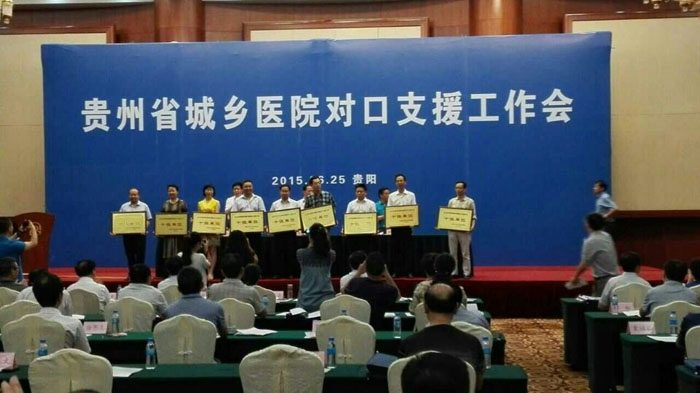 ??? 6月25日喜訊傳來,在貴陽召開的貴州省城鄉(xiāng)醫(yī)院對口支援工作會上,貴州省衛(wèi)生計生委黨組副書記、副主任黃平宣讀了《貴州省衛(wèi)生計生委關(guān)于2014年度貴州省城鄉(xiāng)醫(yī)院對口支援工作考核結(jié)果的通報》,并向城鄉(xiāng)醫(yī)院對口支援工作“十佳單位”和“成績突出個人”授牌。衢州市人民醫(yī)院在全省41家有支援任務(wù)的醫(yī)院中脫穎而出,被評為“浙黔對口支援醫(yī)院十佳單位”,周見副書記在大會上作交流發(fā)言。
