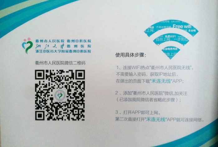 在 WiFi無線網(wǎng)絡(luò)服務(wù)下,患者及家屬可通過智能手機(jī)搜索無線局域網(wǎng)“衢州人醫(yī)免費無線”連接之后,打開瀏覽器下載“禾連無線”App,添加衢州市人民醫(yī)院微信公眾號并關(guān)注,即可進(jìn)行高速上網(wǎng)。wifi使用專用網(wǎng)絡(luò),IP地址清晰,網(wǎng)絡(luò)安全有保障,能提供更好地上網(wǎng)體驗,營造了利于減壓的候診環(huán)境,有效緩解了患者及家屬等待的焦躁情緒。
