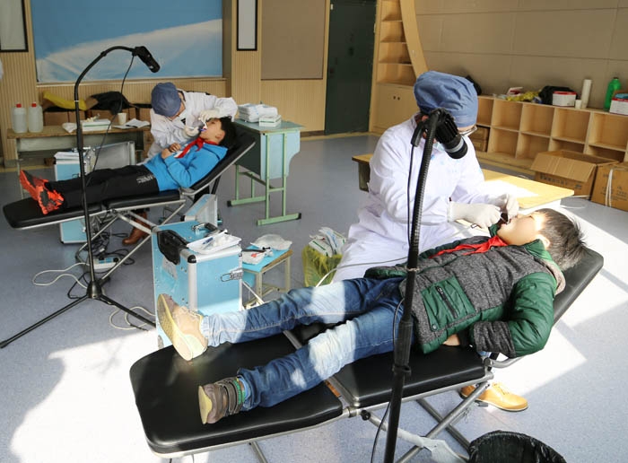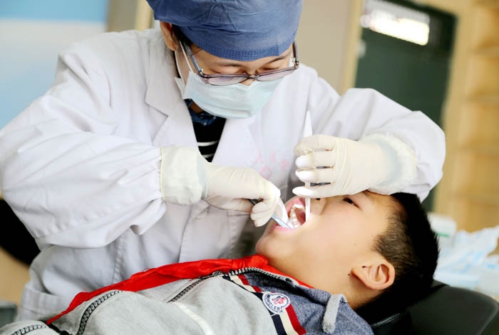 口腔科醫(yī)師為學(xué)生做口腔檢查