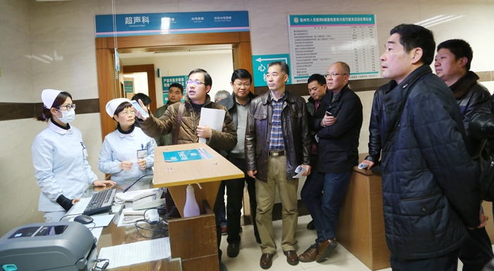 ??? 市衛(wèi)生信息中心負責人胡雅國現(xiàn)場介紹了“智慧衛(wèi)生健康衢州”具備的六大功能,即在線預約掛號、檢驗檢查查詢、院外候診服務、區(qū)域影像共享、區(qū)域診療信息、醫(yī)療服務評價。市局領導一行分別到門診大廳的自助服務區(qū)、醫(yī)生診室工作站、檢驗科、超聲科、放射科等地點,現(xiàn)場體驗了各項功能的應用,交流和探討實際使用過程中存在的問題及改進意見。