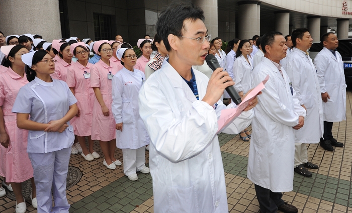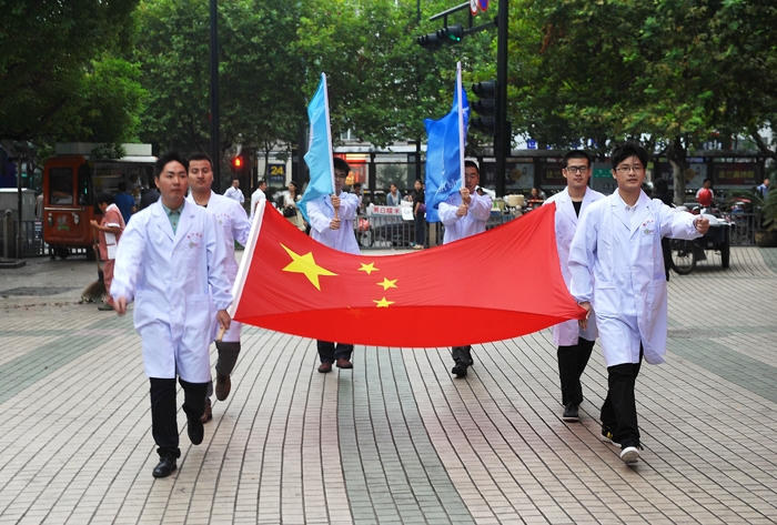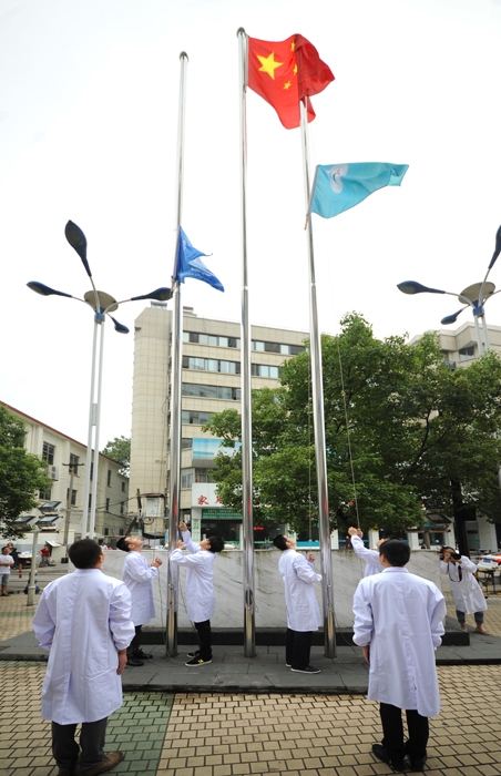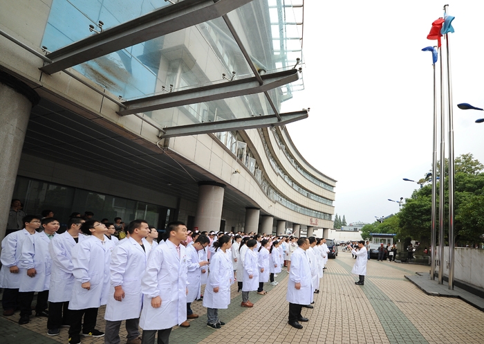 ??? 面對在晨曦中迎風(fēng)飄揚的五星紅旗,洋溢著一種強烈的愛國熱情。唱院歌,升院旗、醫(yī)學(xué)會會旗,讓我們堅守“健康所系,生命相托”的神圣使命,牢記“恪盡職守?善待病人”的服務(wù)宗旨,謹記“忠誠、嚴(yán)謹、謙和、創(chuàng)新”的八字院風(fēng)。