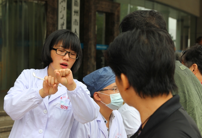 ??? 義診活動吸引了很多市民駐足咨詢,口腔科的醫(yī)護(hù)人員認(rèn)真解答并宣傳齲病、牙周病的防治和義齒修復(fù)等口腔衛(wèi)生保健知識;示范正確刷牙方法,詳細(xì)講解潔治術(shù)、活動義齒的佩戴和清洗等相關(guān)知識。市民陳大爺表示:“這個(gè)活動好,以前不懂,不知道牙也有這么多毛病。現(xiàn)在知道了,以后要好好保護(hù)!”
