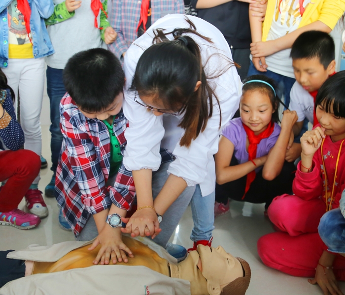 ?? “咦,護(hù)士姐姐,我這樣按壓對不對”、“護(hù)士姐姐,我這力氣夠大了嗎”“醫(yī)生叔叔,我打電話120該怎么說呀”……在新華小學(xué)五樓技能實(shí)驗(yàn)室里同學(xué)們爭先恐后地提出各種問題。