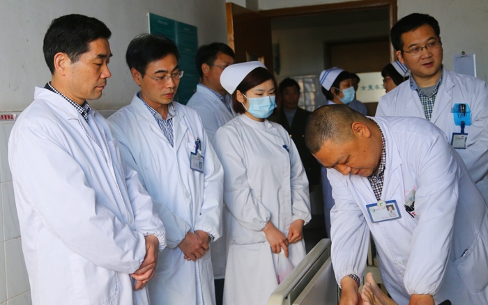 ??? 4月14日上午,市衛(wèi)生局黨委書(shū)記、局長(zhǎng)陳根成帶領(lǐng)局機(jī)關(guān)黨員干部一行六人來(lái)到我院,參加了神經(jīng)外科、心血管內(nèi)科的晨間交接班,并與神經(jīng)外科、普外一科的診療組一起進(jìn)行了三級(jí)查房。