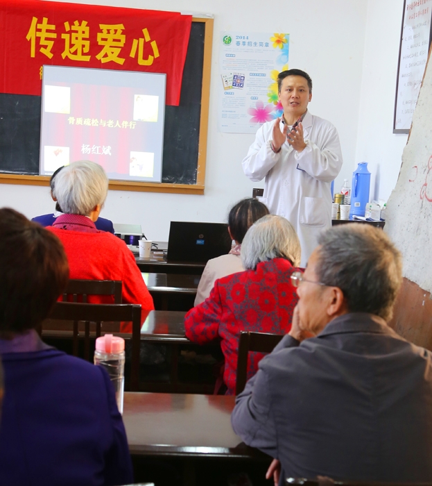 ??? 據(jù)了解,為提高廣大民眾對骨質(zhì)疏松癥的認(rèn)識,進(jìn)一步地宣傳防治骨質(zhì)疏松的重要性,內(nèi)分泌科全體醫(yī)生與護(hù)士一起組成骨質(zhì)疏松宣教隊,2014年度每月進(jìn)社區(qū)、下基層,開展“關(guān)注健康 傳遞愛心”義診活動,為廣大群眾進(jìn)行骨質(zhì)疏松癥與糖尿病的宣教,免費提供血糖、血壓測定以及超聲骨密度檢查。