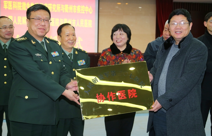 ??? 3月6日上午,中國人民解放軍三〇七醫(yī)院與我院協(xié)作簽約授牌儀式在衢州市行政中心三樓會議室舉行。軍事醫(yī)學科學院副院長徐卸古將軍、軍醫(yī)科院微生物流行病研究所所長曹務(wù)春、副所長房彤宇、解放軍三〇七醫(yī)院副院長張宏、副政委魏建國、副市長馬梅芝、市人大常委會副主任童建中、市政協(xié)副主席王建華等領(lǐng)導參加了簽約儀式。??