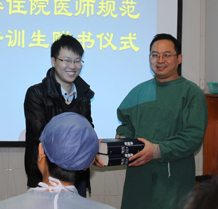 ??? 近日,我院麻醉科在每周例行的小講課上,舉行了住院醫(yī)師規(guī)范化培訓生贈書儀式。向來自本市各兄弟醫(yī)院及貴州六枝特區(qū)人民醫(yī)院共6名青年醫(yī)師捐贈了《現(xiàn)代麻醉學》(上、下冊)一套,并在書的扉頁附上了麻醉科全體帶教老師的簽名。