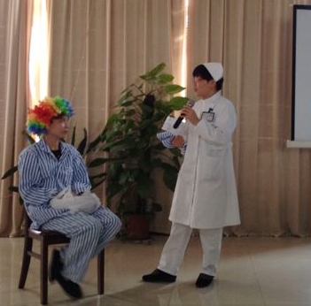 ??? 江雅倩護士扮演的“患者”,身穿病人服,頭戴一頂五彩小丑帽, “責(zé)任護士”汪婭君詳細(xì)地給“患者”介紹了術(shù)前相關(guān)注意事項,演示了“深呼吸”、“有效咳嗽咳痰”、“體位更換”等有針對性的宣教項目。隨著“患者”清脆響亮的咳嗽聲,引來現(xiàn)場一陣掌聲,這是由我院肝膽外科護理人員自編自演、角色模擬,以住院病人術(shù)前宣教為主線的情景劇演練式護理查房的場景。