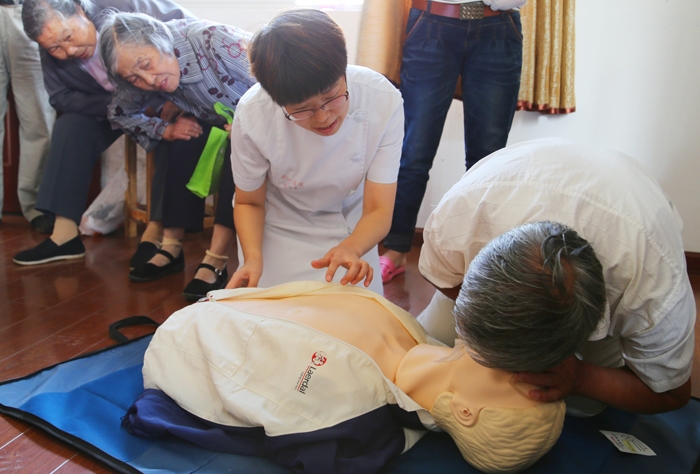 ??? 活動(dòng)當(dāng)天醫(yī)護(hù)人員利用自己的專業(yè)特長(zhǎng)免費(fèi)為50余名老人測(cè)量了血糖和血壓,進(jìn)行了體檢,并向他們現(xiàn)場(chǎng)示范指導(dǎo)心肺復(fù)蘇的方法和應(yīng)急處理措施,發(fā)送健康教育知識(shí)手冊(cè)100余份,耐心解答居民咨詢的健康問題。根據(jù)老年人年齡大易導(dǎo)致誤用藥、亂用藥等特點(diǎn),為老人解讀藥物的正確保存方法,高血壓的保健知識(shí)及藥物使用注意事項(xiàng),吸入劑的使用方法,女性特殊時(shí)期用藥注意事項(xiàng)。大家細(xì)致耐心的服務(wù)受到了居民們一致好評(píng)。