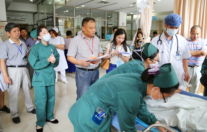 ??? 8月14日下午,衢州市人民醫(yī)院急診科內(nèi),醫(yī)護(hù)人員正緊張地對(duì)一位“上消化道出血”的“患者”進(jìn)行搶救,11名專家評(píng)委目不轉(zhuǎn)睛地對(duì)各個(gè)環(huán)節(jié)進(jìn)行認(rèn)真觀察和評(píng)分。這個(gè)場(chǎng)景正在進(jìn)行的是一場(chǎng)全院性多科室協(xié)作的臨床模擬案例應(yīng)急演練,相關(guān)醫(yī)護(hù)人員按照衢州市衛(wèi)生局專家組制定的各種情景,按規(guī)定程序和要求對(duì)模擬病例進(jìn)行急救。專家組對(duì)現(xiàn)場(chǎng)轉(zhuǎn)送病人過(guò)程、急救的方式、急救操作程序和行政、后勤保障工作等環(huán)節(jié)進(jìn)行全程考評(píng),其中一位專家不時(shí)扮演“患者家屬“角色制造一個(gè)又一個(gè)的難題。整個(gè)演練過(guò)程緊張有序,從物資配備、安全轉(zhuǎn)運(yùn)、院內(nèi)救助搶救,所有環(huán)節(jié)醫(yī)護(hù)人員都到位迅速、配合默契,搶救過(guò)程合理,節(jié)奏緊湊,各項(xiàng)操作穩(wěn)、準(zhǔn)、快,體現(xiàn)了急救人員訓(xùn)練有素的業(yè)務(wù)素質(zhì)。