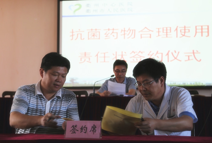 ??? 簽約儀式由院黨委書記徐天才主持,院長(zhǎng)陳震宏與臨床科室代表:外科片、內(nèi)科片、重癥醫(yī)學(xué)科、普外科責(zé)任人簽定《衢州市人民醫(yī)院抗菌藥物合理使用責(zé)任狀》。