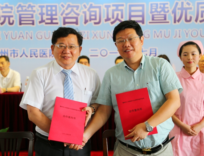 ??? 7月14日上午,衢州市人民醫(yī)院與臺灣秀傳醫(yī)院管理咨詢項(xiàng)目暨優(yōu)質(zhì)護(hù)理管理論壇啟動(dòng)儀式在五樓學(xué)術(shù)報(bào)告廳隆重舉行。臺灣秀傳醫(yī)院行政副院長陳鴻文,教育培訓(xùn)中心主任楊青娥,護(hù)理部主任陳碧惠,秀傳管理咨詢公司、醫(yī)院合作發(fā)展中心執(zhí)行長林華庭,市衛(wèi)生局黨委書記、局長陳根成,市臺辦主任吾炳才,市衛(wèi)生局黨委副書記楊云貴,副局長周衛(wèi)華,市人民醫(yī)院院長陳震宏出席簽約儀式,院黨委書記徐天才主持儀式,我院黨政班子成員、班組長以上干部及部分兄弟醫(yī)院同仁參加了儀式。
