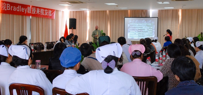 ??? 近年來,我院一直致力于為護(hù)理人員提供近距離與國際專家學(xué)習(xí)交流的機(jī)會(huì),使護(hù)理理念和護(hù)理水平與國際接軌,推動(dòng)醫(yī)院醫(yī)療技術(shù)水平的進(jìn)一步提高。這次邀請(qǐng)到了來自美國明尼蘇達(dá)州東南科技學(xué)院的“喬治·布萊德利·阿爾索普(George Bradley Alsop)”教授來進(jìn)行關(guān)于醫(yī)院管理的交流,聽取布萊德利先生介紹美國的護(hù)理教育和護(hù)理管理。本次會(huì)議全程由我院兒科護(hù)士洪顏翻譯并介紹我院的護(hù)理管理和護(hù)理教育體系,隨后雙方進(jìn)行了互動(dòng)交流。