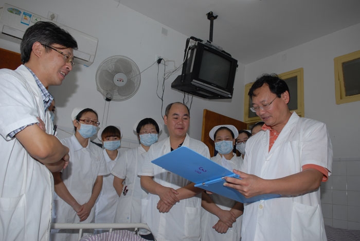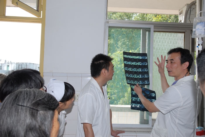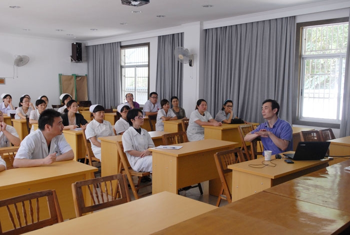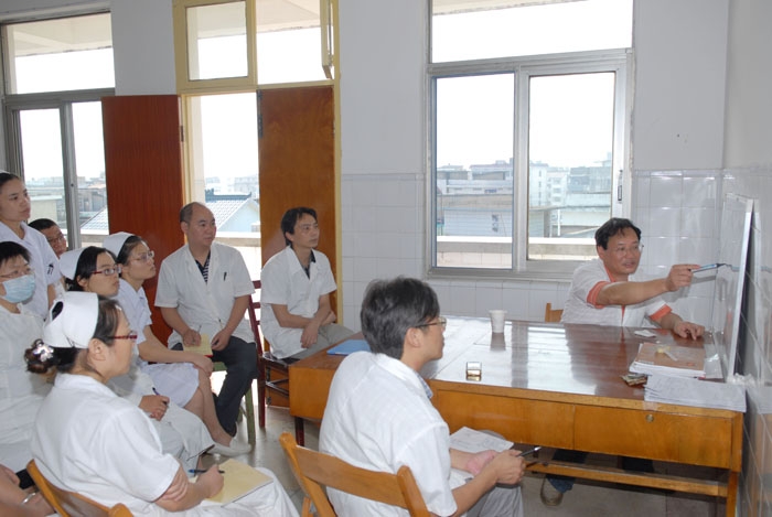??? 肝膽外科詹銀初主任一下車就立即穿上工作服進(jìn)入病房,指導(dǎo)該院外科醫(yī)生規(guī)范開(kāi)展三級(jí)查房。隨后進(jìn)行“‘T’管放置及拔管的注意事項(xiàng)”的實(shí)用講課。