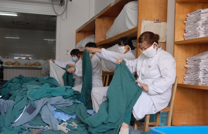 ????到時(shí)恰巧遇到八名戴著草帽、口罩,裹著毛巾,穿著白大褂的洗滌女工們將一批床單送到曬衣場(chǎng)晾曬。烈日藍(lán)天下,各色床單隨著微風(fēng)輕輕擺動(dòng),別有一番風(fēng)味。洗衣間負(fù)責(zé)人傅愛(ài)軍介紹,現(xiàn)在每天都有近三千件衣物需要清洗,包括床單、被套、各類(lèi)手術(shù)布、白大褂等,“每天8點(diǎn)、9點(diǎn)、12點(diǎn)和下午2點(diǎn),總院會(huì)有專(zhuān)車(chē)把待洗衣物送過(guò)來(lái),3個(gè)小時(shí)后又要把它們送回去?!耙?yàn)槭中g(shù)多,手術(shù)布使用量也大,所以手術(shù)布清洗量是很大的?!?BR>????在洗衣房里,?四個(gè)2米左右高的專(zhuān)用洗衣機(jī)正在運(yùn)轉(zhuǎn),一直發(fā)出“哄哄哄”的聲響,并散發(fā)著懾人的熱氣。洗滌工姜阿姨向記者介紹了洗滌大致的流程:首先將待洗衣物進(jìn)行開(kāi)始分類(lèi),根據(jù)種類(lèi)將它們分別浸泡在不同的消毒水池中,其中兩個(gè)水池浸泡普通床單,一個(gè)浸泡白大褂,一個(gè)浸泡帶血漬的衣物,而其它來(lái)自傳染科的衣物床單被裝在一個(gè)黑色密封塑料袋中,進(jìn)行特殊的消毒處理?!敖葜笪覀儠?huì)根據(jù)分類(lèi)把衣物放進(jìn)不同洗衣機(jī)里,進(jìn)行90℃的高溫消毒洗滌,這個(gè)過(guò)程需要1個(gè)小時(shí)20分鐘。然后小件的進(jìn)行烘干,大件的則進(jìn)行晾曬,最后將干凈的衣物進(jìn)行折疊。”姜阿姨指著一旁整齊的衣物說(shuō),“即便是一條小小的手術(shù)布也需要在我們這里待上3個(gè)小時(shí)。整個(gè)洗滌的過(guò)程,我們都要穿著白大褂戴著口罩?!庇浾甙l(fā)現(xiàn)姜阿姨的頭發(fā)已經(jīng)滿(mǎn)是汗?jié)n,她笑笑說(shuō)自己早已經(jīng)習(xí)慣了。