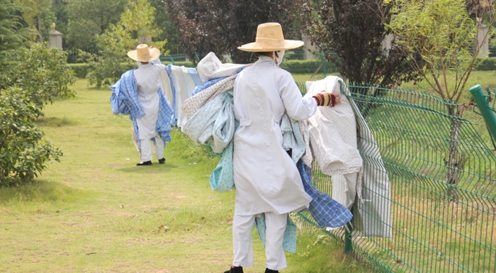 ????談話(huà)間,姜阿姨發(fā)現(xiàn)收衣服的時(shí)間到了,便戴上草帽,叫上了其他女工一起趕去曬衣場(chǎng)?!拔覀?cè)缟?點(diǎn)半就要到這里,下午5點(diǎn)半下班,中間幾乎沒(méi)空閑的時(shí)間。”