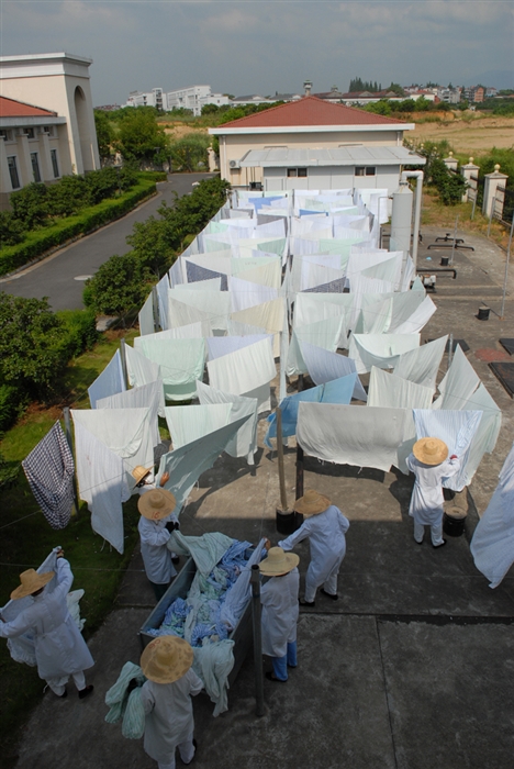 ??? 氣溫又悄悄爬到了37℃之上,對(duì)于普通市民已經(jīng)難忍,但有一群人卻不僅要把自己裹得嚴(yán)嚴(yán)實(shí)實(shí)的,還得穿梭在烈日下的曬衣場(chǎng)與悶熱的洗衣房之間,她們便是我院的被服洗滌工們。昨日上午,筆者陪記者來(lái)到浮石院區(qū),走近了高溫下的洗滌工。