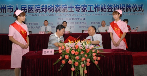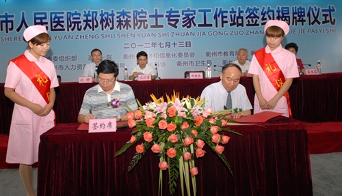 羅衛(wèi)紅副市長主持當天的簽約揭牌儀式。中國工程院院士、浙醫(yī)一院院長鄭樹森與市人民醫(yī)院陳震宏院長簽署了《院士專家工作站協(xié)議》。市委副書記、代市長沈仁康到院祝賀并與鄭樹森院士共同為工作站揭牌。浙江大學(xué)醫(yī)學(xué)院附屬第一醫(yī)院副院長沈曄和院士專家團隊成員、市人大副主任童建中、市政協(xié)副主席呂玉茹等相關(guān)部門負責(zé)人出席簽約揭牌儀式。