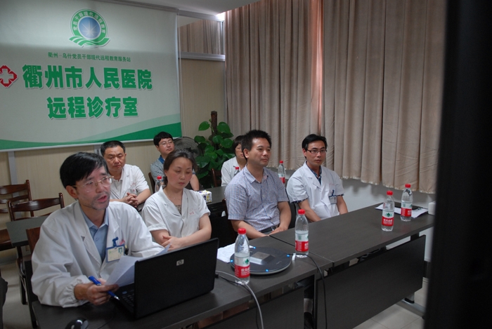 ????6月29日上午,在衢州市人民醫(yī)院遠程診療室里,市人民醫(yī)院神經(jīng)內(nèi)科林海燕主任、腎內(nèi)科吳金土主任正和新疆烏什縣人民醫(yī)院的醫(yī)生進行視頻通話,聯(lián)合指導烏什縣人民醫(yī)院的醫(yī)生進行疑難病例的診斷和治療用藥。