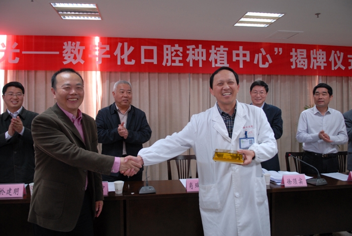 肖瑞峰代表浙江工業(yè)大學(xué)向我院贈(zèng)送了該校最新科技成果——6D數(shù)字化導(dǎo)航種植工具系統(tǒng)。該工具系統(tǒng)是目前國(guó)內(nèi)唯一獲得國(guó)家醫(yī)療器械注冊(cè)的數(shù)字化導(dǎo)航種植工具系統(tǒng)。