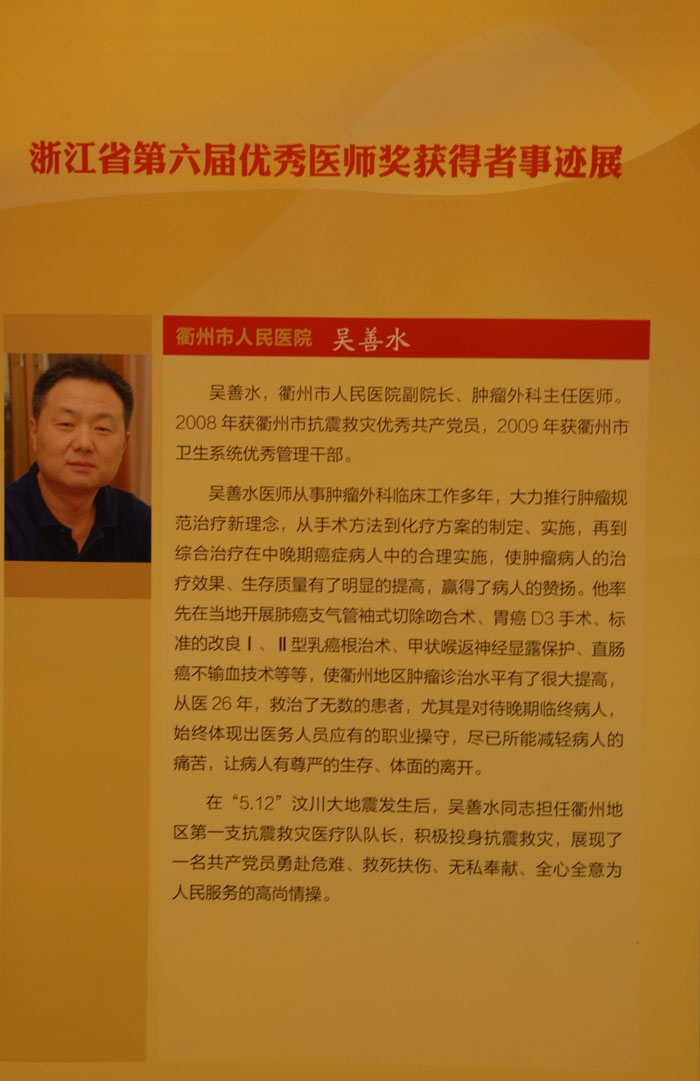 在抗震救災(zāi)的第一線,吳善水同志用他的實(shí)際行動展現(xiàn)了一名普通共產(chǎn)黨員的優(yōu)秀品質(zhì),一名白衣天使的高尚情操,不辱衢州的黨和政府、鄉(xiāng)親父老、同事們的寄托和信任,為地震災(zāi)區(qū)作出了很大的貢獻(xiàn)。