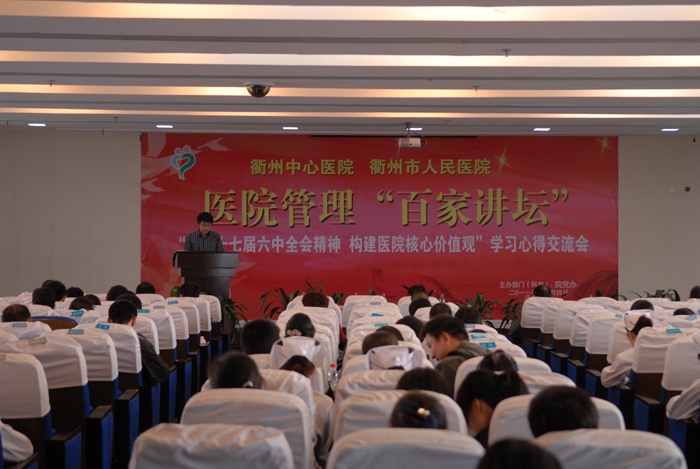 11月4日下午,我院在學(xué)術(shù)報(bào)告廳舉行醫(yī)院百家講壇。本期百家講壇的主題是“學(xué)習(xí)十七屆六中全會(huì)精神,構(gòu)建醫(yī)院核心價(jià)值觀”學(xué)習(xí)心得交流。來自醫(yī)院行政支部、后勤支部、門診支部、外科支部、內(nèi)科支部推薦的10名選手在講壇上暢談了學(xué)習(xí)醫(yī)院核心價(jià)值觀的心得體會(huì)。徐周佳院長、徐天才書記等院領(lǐng)導(dǎo)參加了本次講壇,徐周佳院長還就“以社會(huì)期望為導(dǎo)向,以病人滿意為標(biāo)準(zhǔn),以集體榮辱為己任,以全員進(jìn)步為共識”的醫(yī)院核心價(jià)值觀闡述了自己的觀點(diǎn),現(xiàn)摘錄如下:
