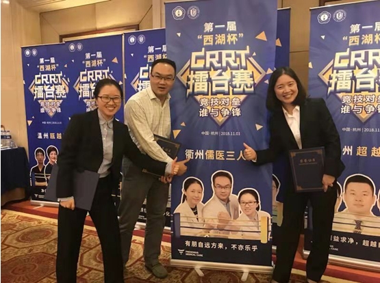 ??? 我院重癥醫(yī)學科羅建副主任醫(yī)師、王丹瓊主治醫(yī)師和盧俊梅副主任護師組成“衢州儒醫(yī)三人”組合,代表衢州參加了第一屆“西湖杯”CRRT擂臺賽,喜獲二等獎。