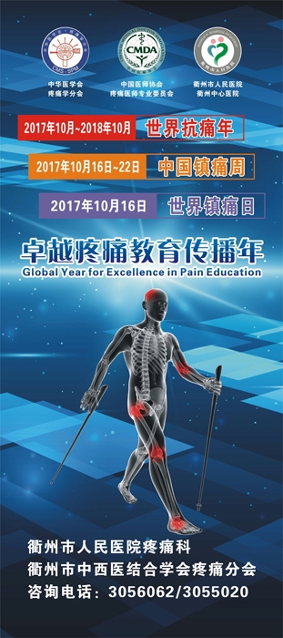 ?? 值此“中國(guó)鎮(zhèn)痛周”來臨之際,衢州市人民醫(yī)院疼痛醫(yī)學(xué)專家將于2017年10月16日上午在西區(qū)美年大健康(白云中大道39號(hào),吾悅廣場(chǎng)對(duì)面)開展義診活動(dòng)。屆時(shí)將針對(duì)大家最為關(guān)注的常見慢性疼痛性疾病如頭痛、頸椎病、肩周炎、腱鞘炎、帶狀皰疹后神經(jīng)痛、骨質(zhì)疏松性疼痛、晚期癌痛、頸腰椎間盤突出癥、坐骨神經(jīng)痛、膝關(guān)節(jié)炎、髖關(guān)節(jié)病等疾病進(jìn)行現(xiàn)場(chǎng)免費(fèi)咨詢,同時(shí)有機(jī)會(huì)獲得免費(fèi)沖擊波及紅外偏正光治療。