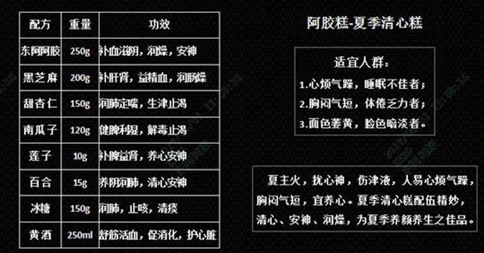 ??? 阿膠滋陰潤燥、補血益氣,配以黑芝麻、南瓜子、甜杏仁、蓮子和百合等,清心健脾,潤肺益腎。夏季清心糕配伍精妙,清心、安神、潤燥,為夏季養(yǎng)顏養(yǎng)生佳品。