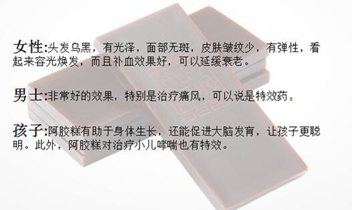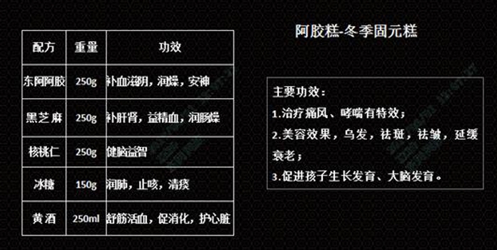 ??? 阿膠固元糕也叫“阿膠核桃糕”,配以核桃仁、黑芝麻、冰糖,用黃酒熬制而成。具有補血滋陰,潤燥,止血之功效;用于血虛萎黃,眩暈心悸,心煩不眠,肺燥咳嗽等癥。