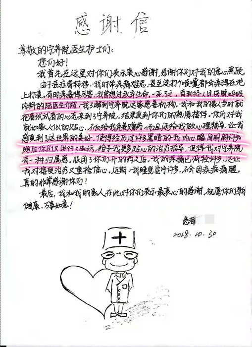 在為戴阿姨服務的102天的時間里,她從剛接受服務時只能躺在床上,到現(xiàn)在疼痛得以緩解,已經(jīng)可以自行翻身坐起,在輔助下能簡單的步行。戴阿姨的兒子看著母親一步步地好轉到安詳離世,真心地感謝醫(yī)護人員的付出,于是親手制作了一面錦旗。