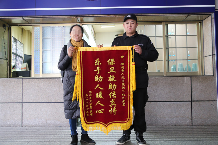 “真的太感謝你了,如果沒有你,我都不敢想象我家先生現(xiàn)在會是什么樣!”12月28日下午,繆女士帶著錦旗來到我院保衛(wèi)處,親手將錦旗送到了保安毛星星的手中。“這是我職業(yè)本能反應,也是我應該做的……”收到錦旗的毛星星略帶笑意,微低下了頭,臉上微微泛紅,連連說著這兩句話。