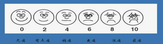 0分:無痛;3分以下:有輕微的疼痛,患者能忍受;4分—6分:疼痛明顯并影響睡眠,需止痛;7分—10分:有漸強烈的疼痛,疼痛難忍