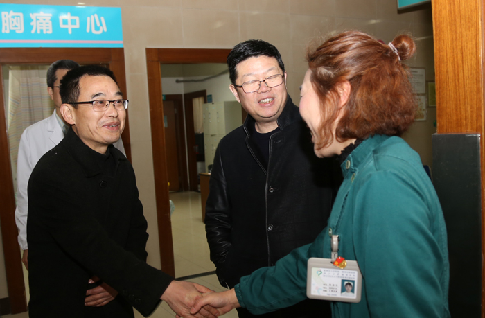 “新年好,辛苦了!”在急診科,姚宏平和醫(yī)護人員握手并親切交談,詳細詢問工作情況??吹酱蠹页瘹馀畈?、精神飽滿,他鼓勵廣大干部職工在新的一年里,繼續(xù)發(fā)揚團結合作的精神,不斷提升工作水平,提高服務質量,以飽滿的精神狀態(tài)和嚴謹的工作作風,團結進取、扎實工作、再接再厲,力爭2019年各項工作再上新臺階,為群眾的生命健康保駕護航,為實現“大健康”發(fā)展的美好愿景添磚加瓦。