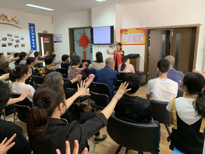 吳芬芝與現(xiàn)場居民互動,教習類風濕性關(guān)節(jié)炎功能鍛煉操。