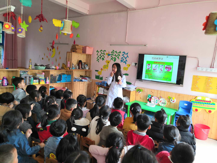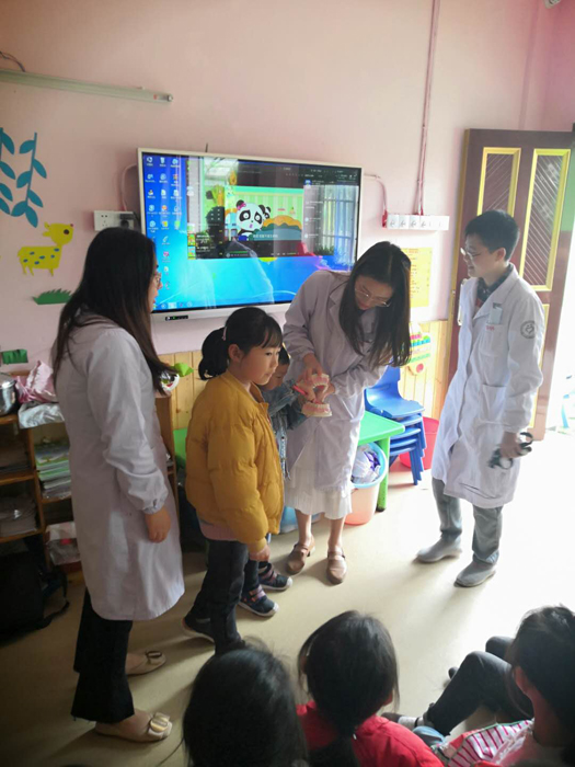 醫(yī)護人員現(xiàn)場用蛋殼與食醋發(fā)生反應(yīng)的實驗生動形象地告訴小朋友們不良飲食習慣給牙齒帶來的危害,并教會小朋友正確的刷牙方法。