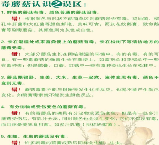 鑒別野生毒蘑菇是否有毒,目前沒(méi)有簡(jiǎn)單易行的鑒別方法。預(yù)防毒蘑菇中毒的根本辦法就是——不要采食野生蘑菇!
