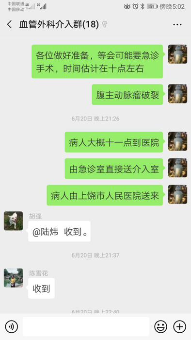 搶救經驗豐富的血管外科值班醫(yī)師程國兵也馬上通知醫(yī)院急診科、麻醉科、手術室做好搶救準備。